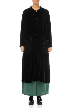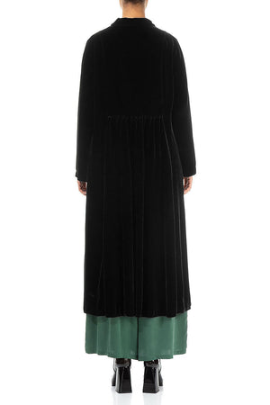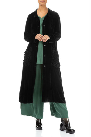 Ruched Pockets Black Silk Velvet Jacket - Coat