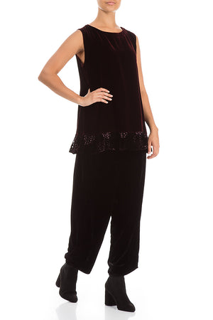 Ruffle Hem Sleeveless Devoré Burgundy Silk Velvet Blouse